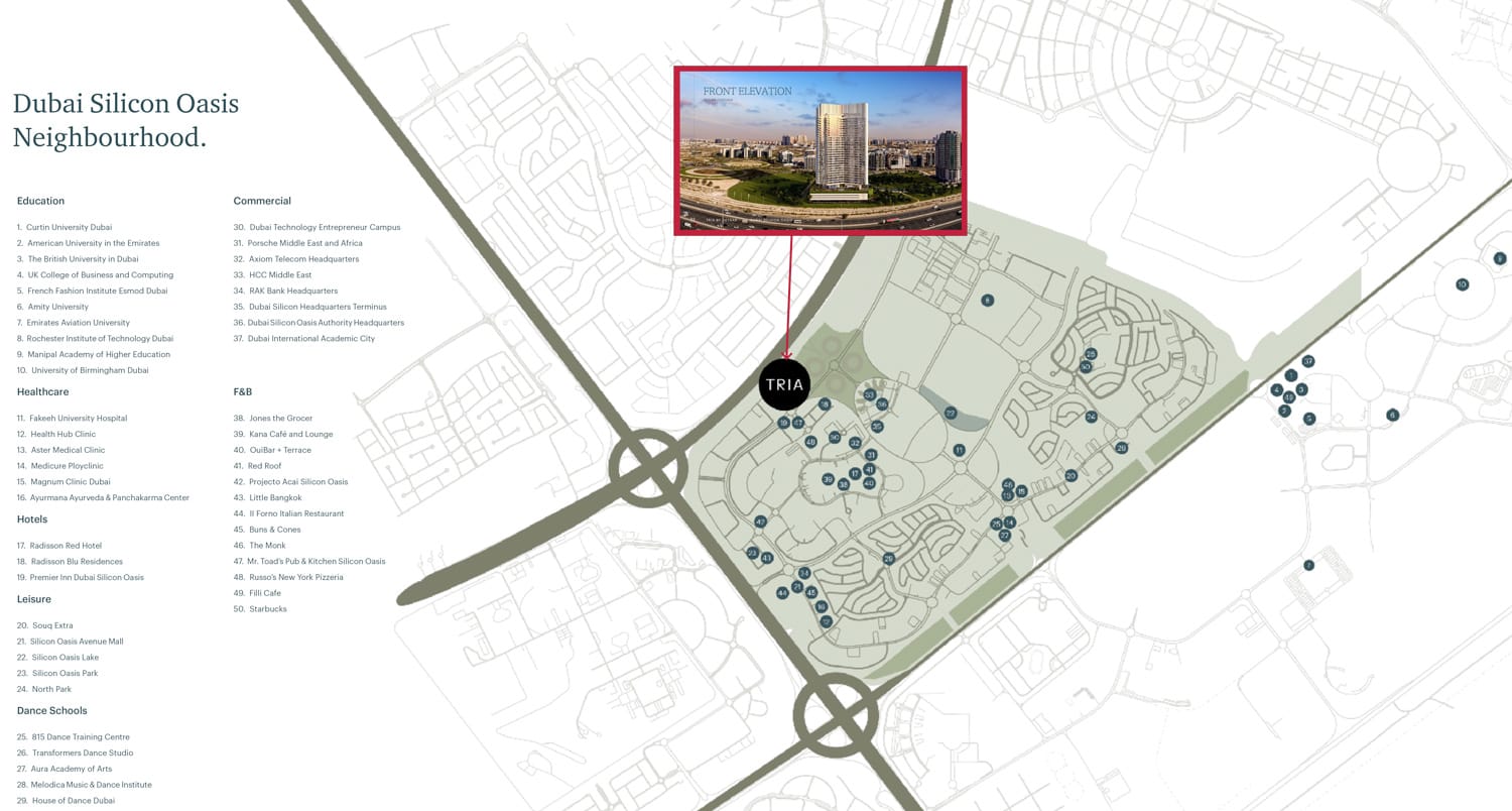 Presenting Tria, a new residential venture at Dubai Silicon Oasis (DSO) with its 3-winged building offering a choice of apartments, podium townhouses and penthouses. It provides rooftop amenities, including the likes of an infinity pool and social areas, as well as garden and manicured lawns, open terrace areas for homeowners and visitors.