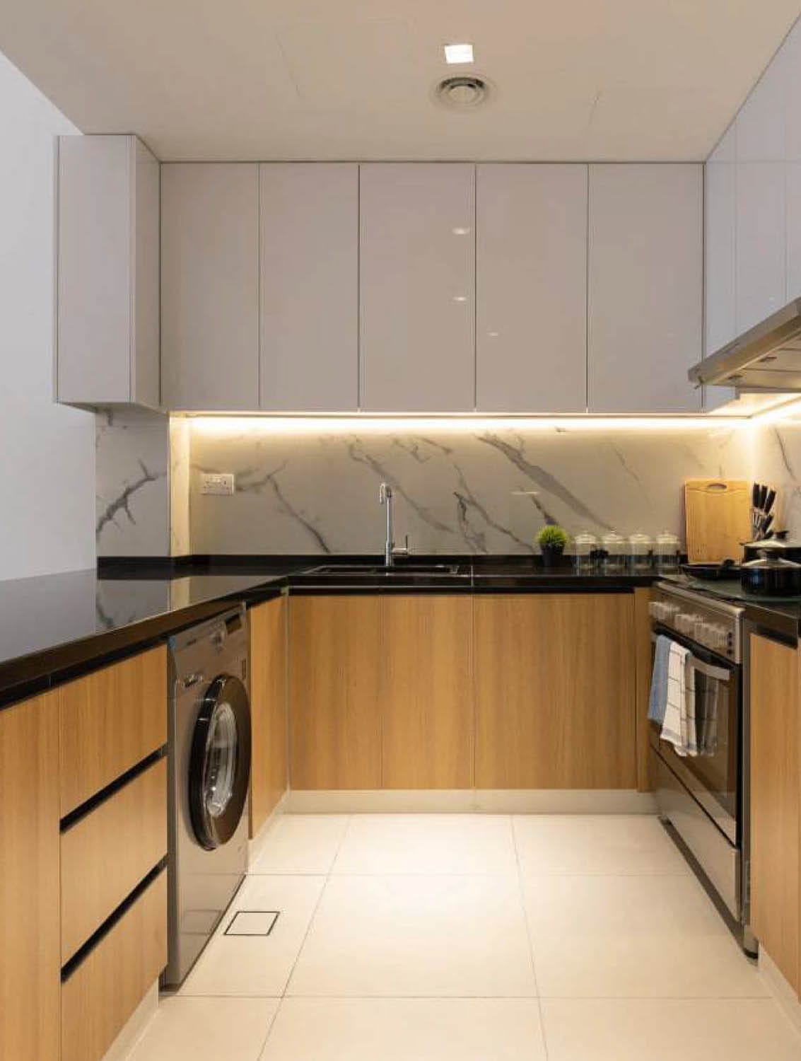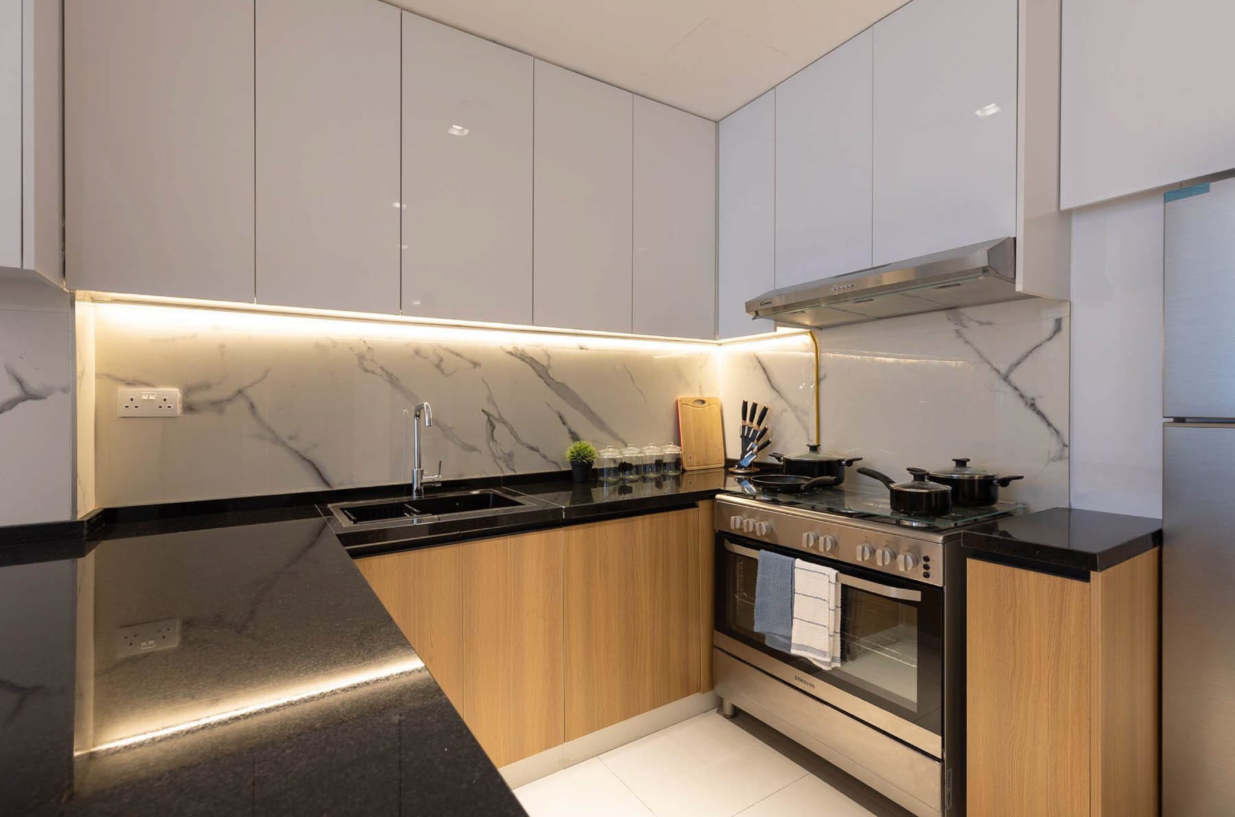The kitchens are equipped with Samsung’s premium range of appliances, including a gas stove, oven, 460L fridge, and a convenient 7KG washing machine. These high-quality appliances are thoughtfully placed within the kitchen for residents’ convenience and efficiency in their daily routines.