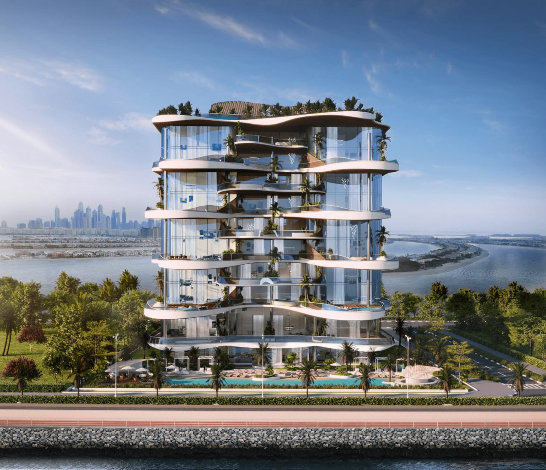 Nestled on the iconic Palm Jumeirah, One Crescent is an ultra-luxury 9-storey residential development by AHS Properties, which is part of the AHS Group. Redefining craftsmanship and sophistication, the exclusive complex will boast a wave-like integrated architecture thanks to individual residential swimming pools and green pockets on each curve of its stunning facade.