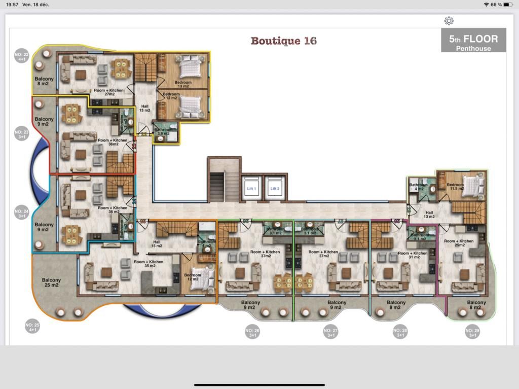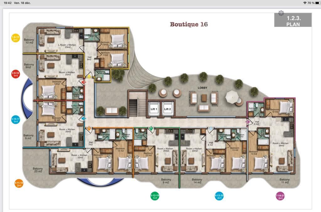 Nowy kompleks mieszkaniowy zlokalizowany jest w Alanyi, w dzielnicy Kargicak. Kompleks składa się z jednego pięciokondygnacyjnego budynku, w którym znajduje się 29 mieszkań o różnych układach: 1+1, 2+1 oraz penthouse'y w układach 3+1 i 4+1. Wszystkie mieszkania będą wynajmowane w pełni umeblowane. Kargicak to najbardziej na wschód wysunięty region Alanyi i być może jeden z najbardziej malowniczych i cichych zakątków w tej części śródziemnomorskiego wybrzeża kurortu w Turcji. To jeden z dynamicznie rozwijających się obszarów Alanyi, który wyróżnia się niską zabudową, dużą ilością zieleni i doskonałymi plażami drobnokamienistymi. Kompleks posiada własny teren z infrastrukturą, która sprawia, że wypoczynek i życie tutaj są tak komfortowe, jak to tylko możliwe. Odległość do morza 200 m. Zakończenie budowy – marzec 2022. O lokalizacji: Kompleks położony jest w Alanyi, 200 m od promenady i plaży. Obok kompleksu znajduje się małe centrum handlowe z supermarketem, restauracją i sklepami.Dzięki komunikacji miejskiej można wygodnie dotrzeć do centrum miasta, głównych dzielnic i licznych atrakcji, w tym słynnej Plaży Kleopatry. Kargıcak jest otoczony ze wszystkich stron roślinnością leśną, reprezentowaną głównie przez drzewa iglaste. Znajdują się tu także sady bananowe i pomarańczowe. Apartamenty: W kompleksie znajdują się cztery rodzaje apartamentów na sprzedaż: (1+1, 2+1, penthouse 3+1 i 4+1). Powierzchnia apartamentów wynosi od 40 do 70 m².